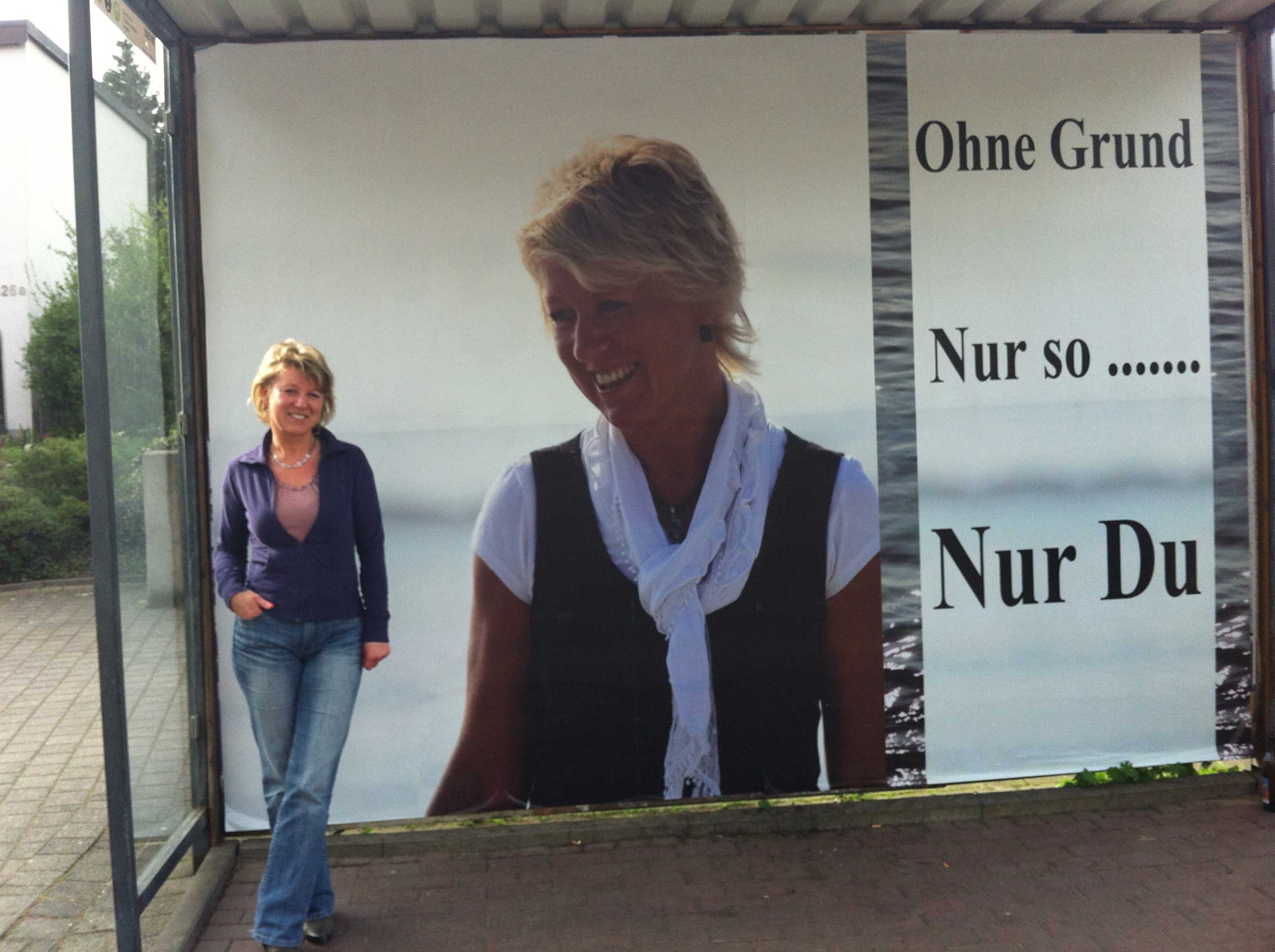 Zu Ihrem Geburtstag hatte ich mir mal was anderes ausgedacht. Da direkt vor Ihrem Büro eine Bushaltestelle liegt, habe ich bereits im Januar die Reklamefläche für 10 Tage gemietet. In den folgenden Wochen arbeitete ich an dem Bild. Ihr Foto war schnell gefunden, aber der Text war nicht so einfach. Es durfte nichts zu persönliches sein, sollte aber schon etwas ausdrücken. Pünktlich zu Ihrem Geburtstag war es dann auch angebracht und Birgit hatte Ihre eigene Haltestelle. Es war interessant zu sehen, wie Autofahrer reagierten als sie Birgit auf dem Foto erkannten. Schlagartig wurden sie langsamer, wendeten und schauten noch einmal genau hin.